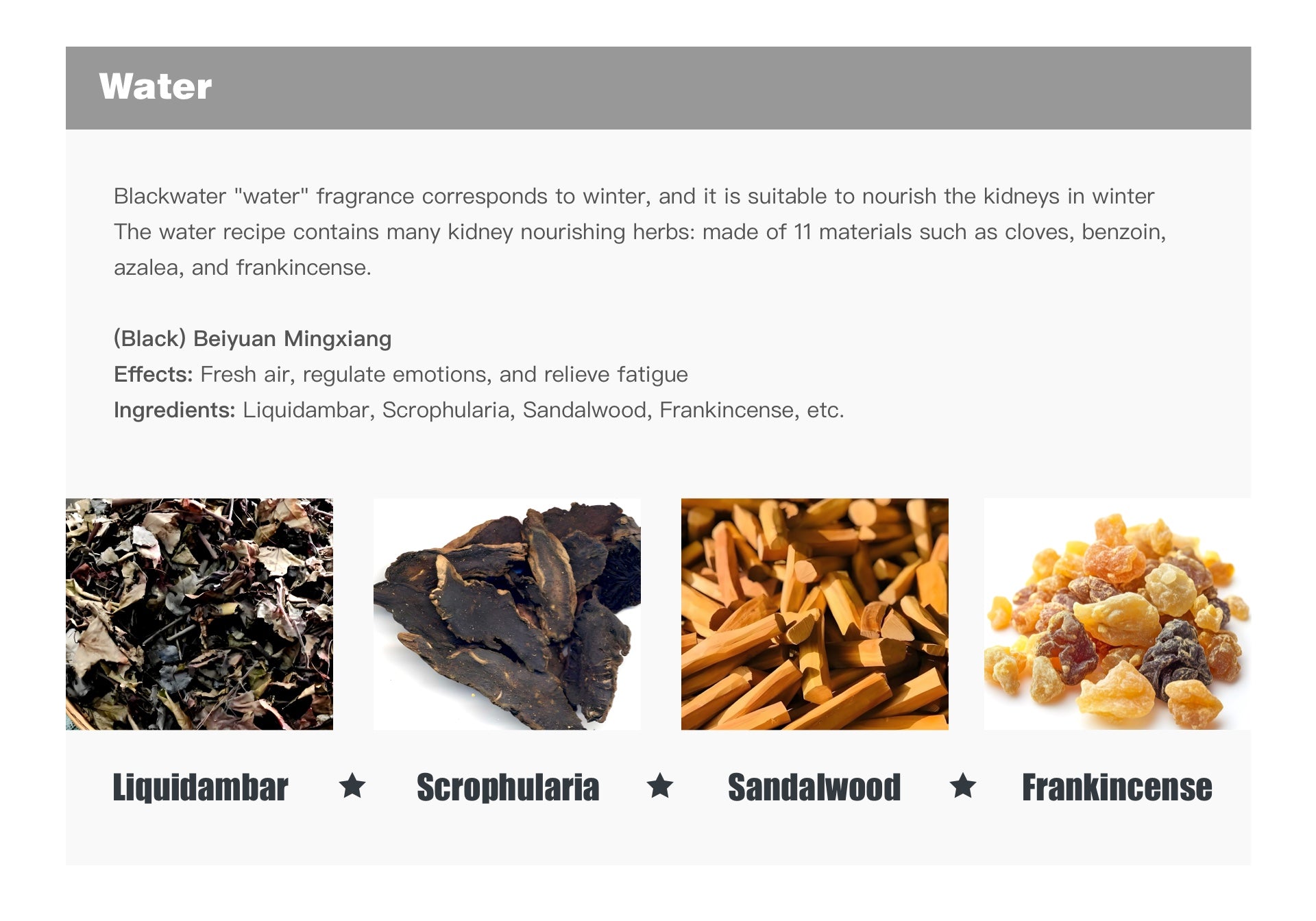 Blackwater "water" fragrance corresponds to winter, and it is suitable to nourish the kidneys in winter