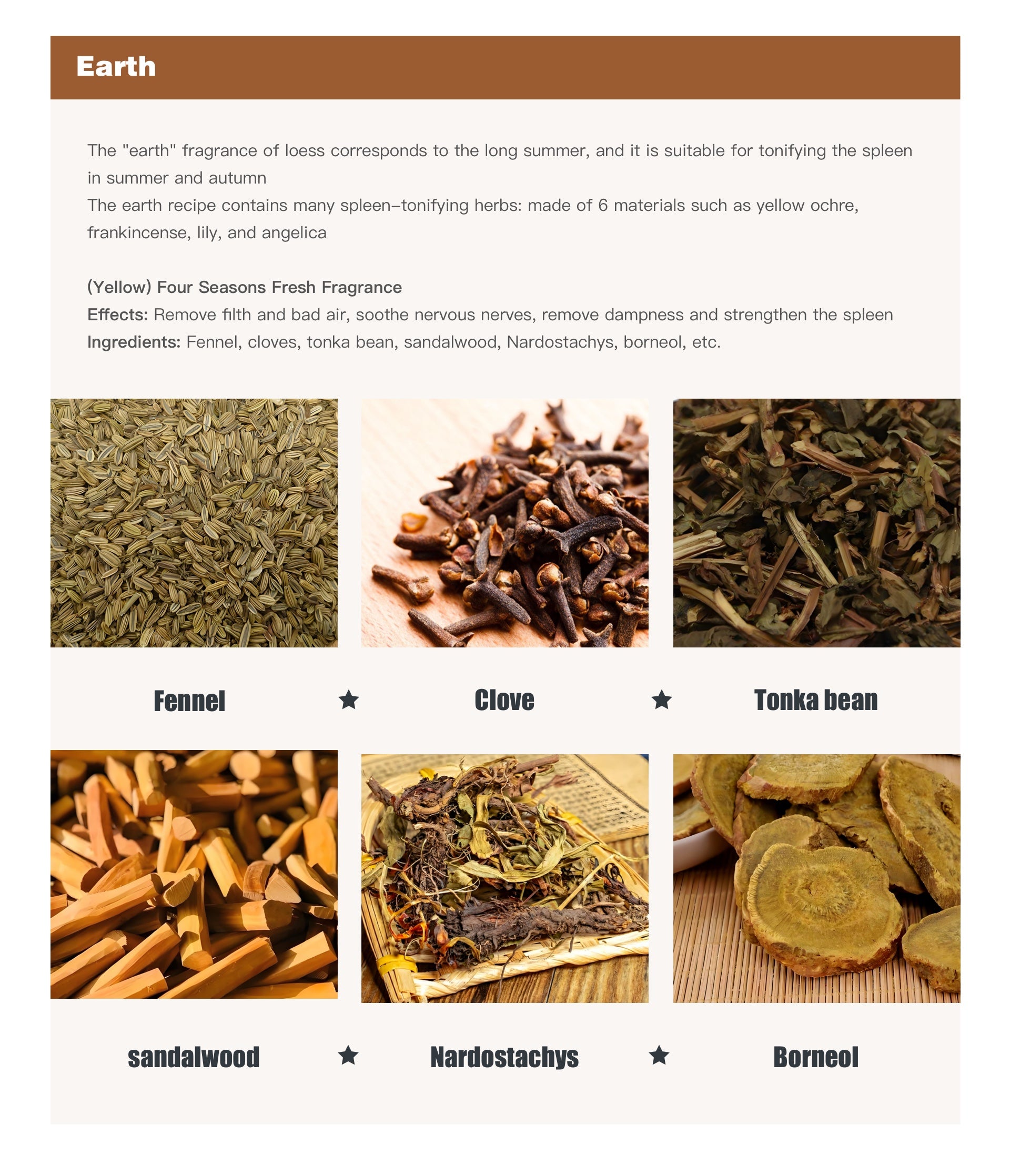 The earth recipe contains many spleen-tonifying herbs: made of 6 materials such as yellow ochre, frankincense, lily, and angelica