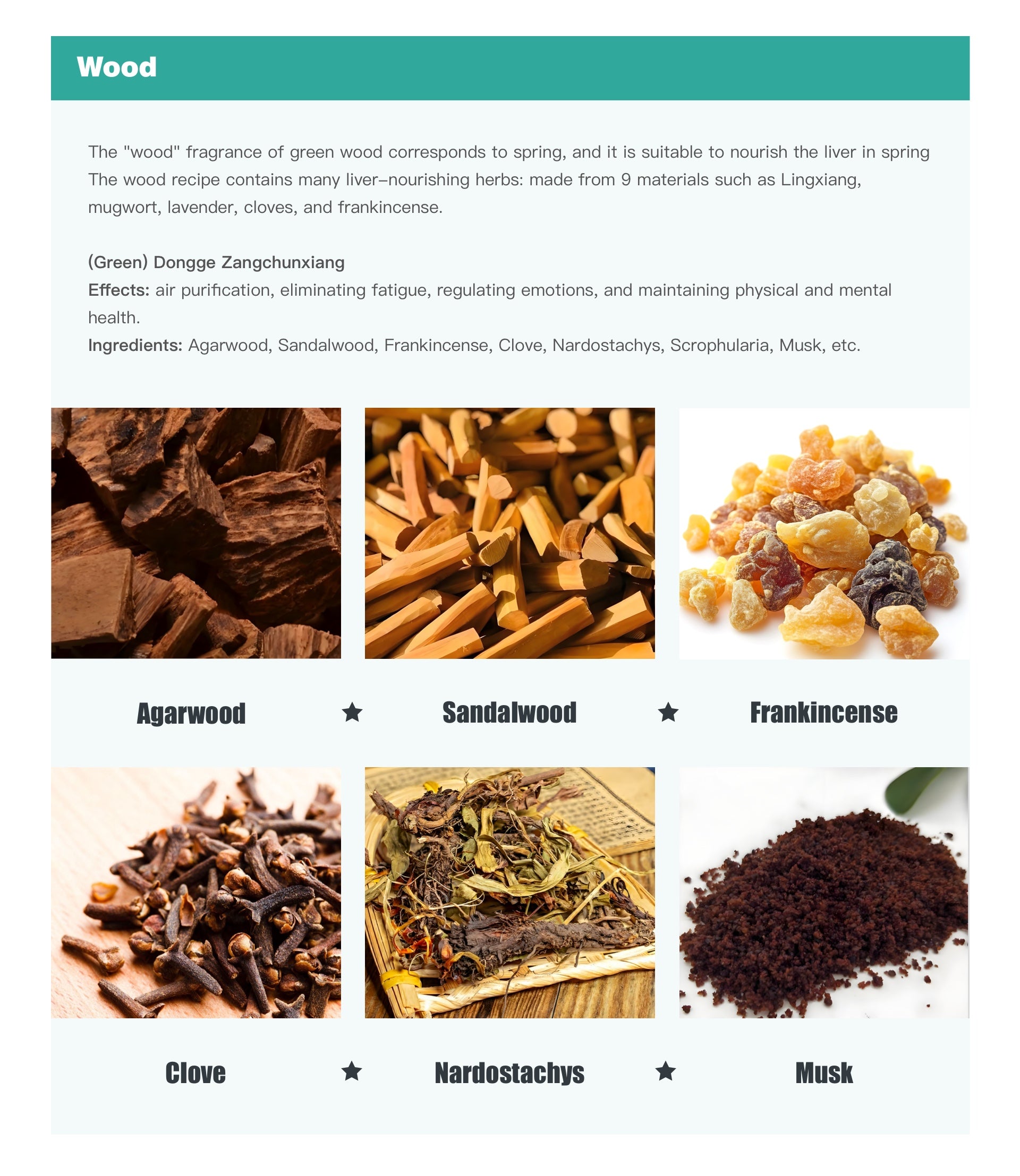 The wood recipe contains many liver-nourishing herbs: made from 9 materials such as Lingxiang, mugwort, lavender, cloves, and frankincense.