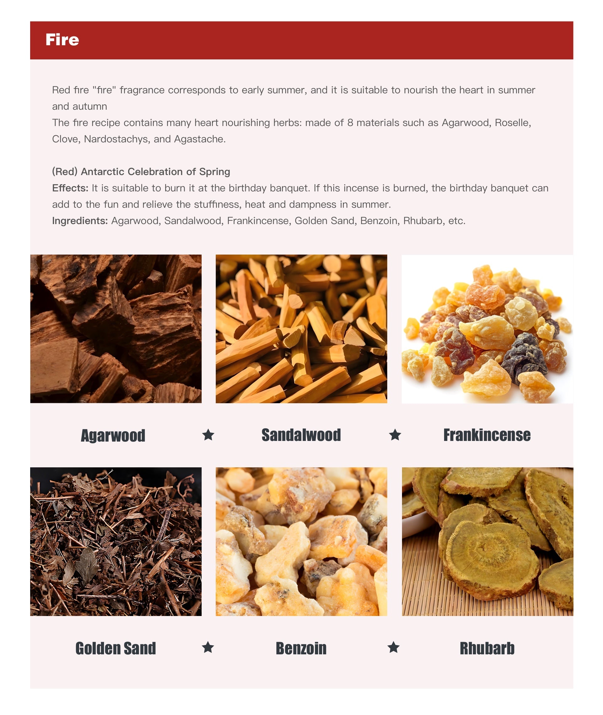 The fire recipe contains many heart nourishing herbs: made of 8 materials such as Agarwood, Roselle, Clove, Nardostachys, and Agastache.