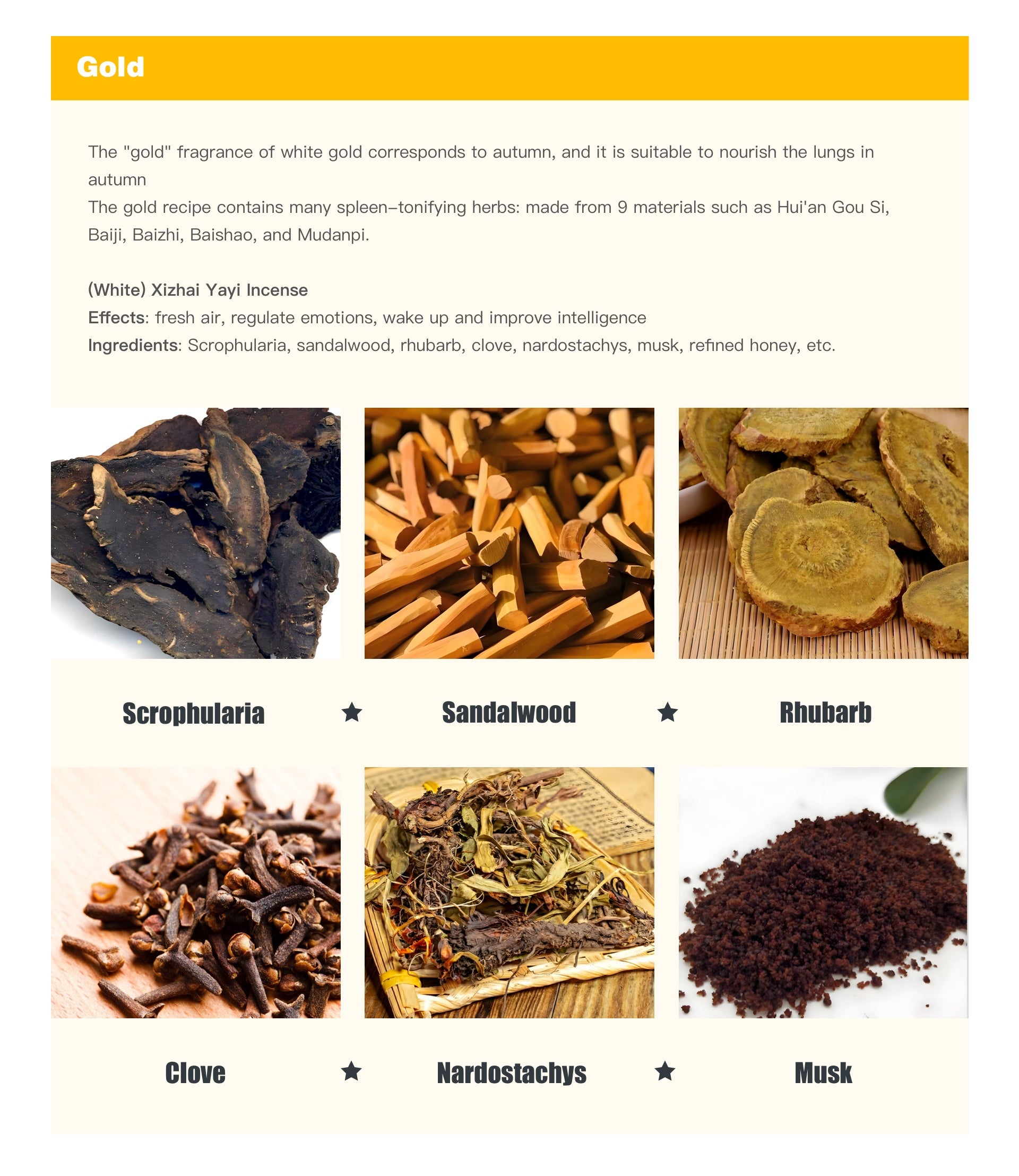 Ingredients: Agarwood, Sandalwood, Frankincense, Golden Sand, Benzoin, Rhubarb, etc.