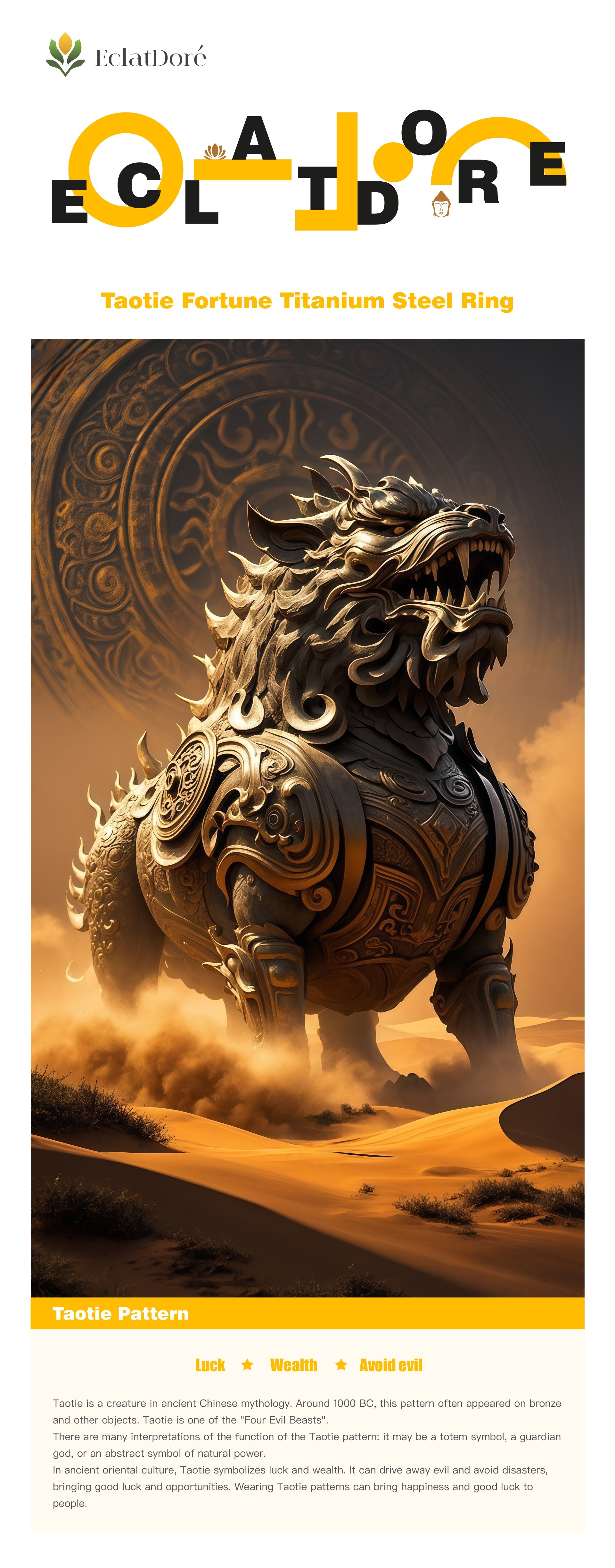 In ancient oriental culture, Taotie symbolizes luck and wealth. It can drive away evil and avoid disasters, bringing good luck and opportunities. Wearing Taotie patterns can bring happiness and good luck to people.