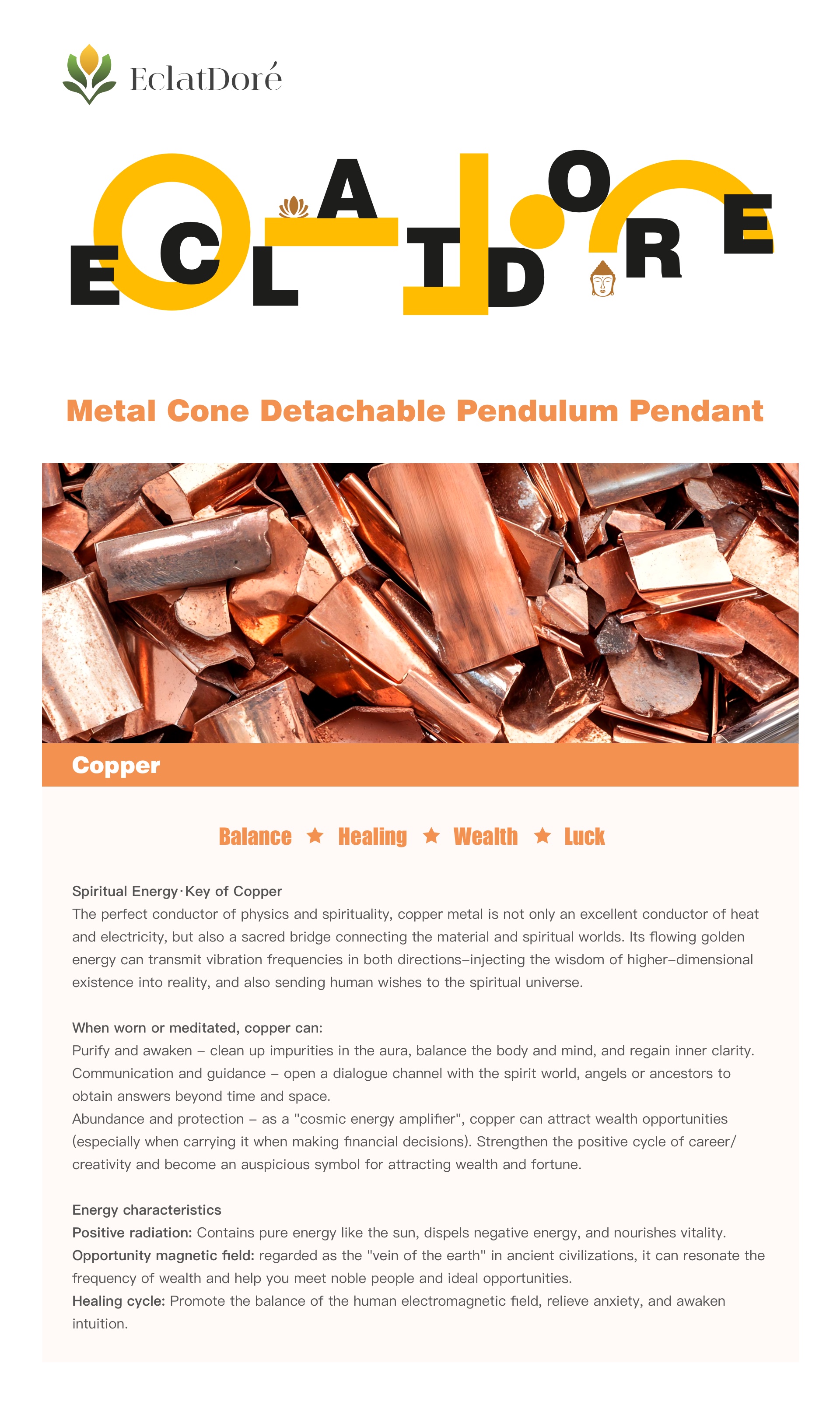 Abundance and protection - as a "cosmic energy amplifier", copper can attract wealth opportunities (especially when carrying it when making financial decisions). Strengthen the positive cycle of career/creativity and become an auspicious symbol for attracting wealth and fortune.
