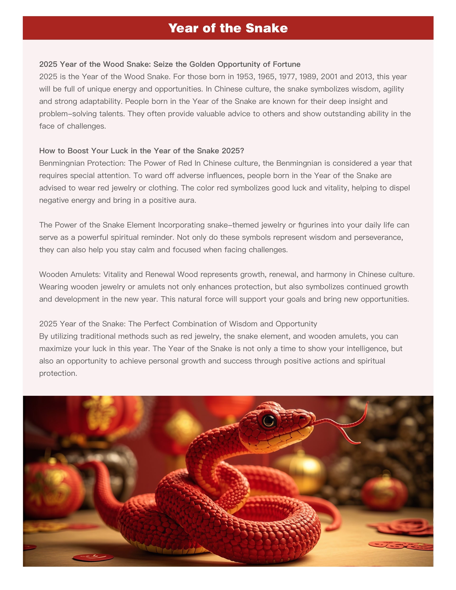 Guardian of the Year of the Snake: The Power of Red In Chinese culture, the Year of the Snake is regarded as a year that requires special attention. To avoid adverse effects, people born in the Year of the Snake are advised to wear red jewelry or red clothing. The color red symbolizes good luck and vitality, and can help dispel negative energy and bring in positive energy.