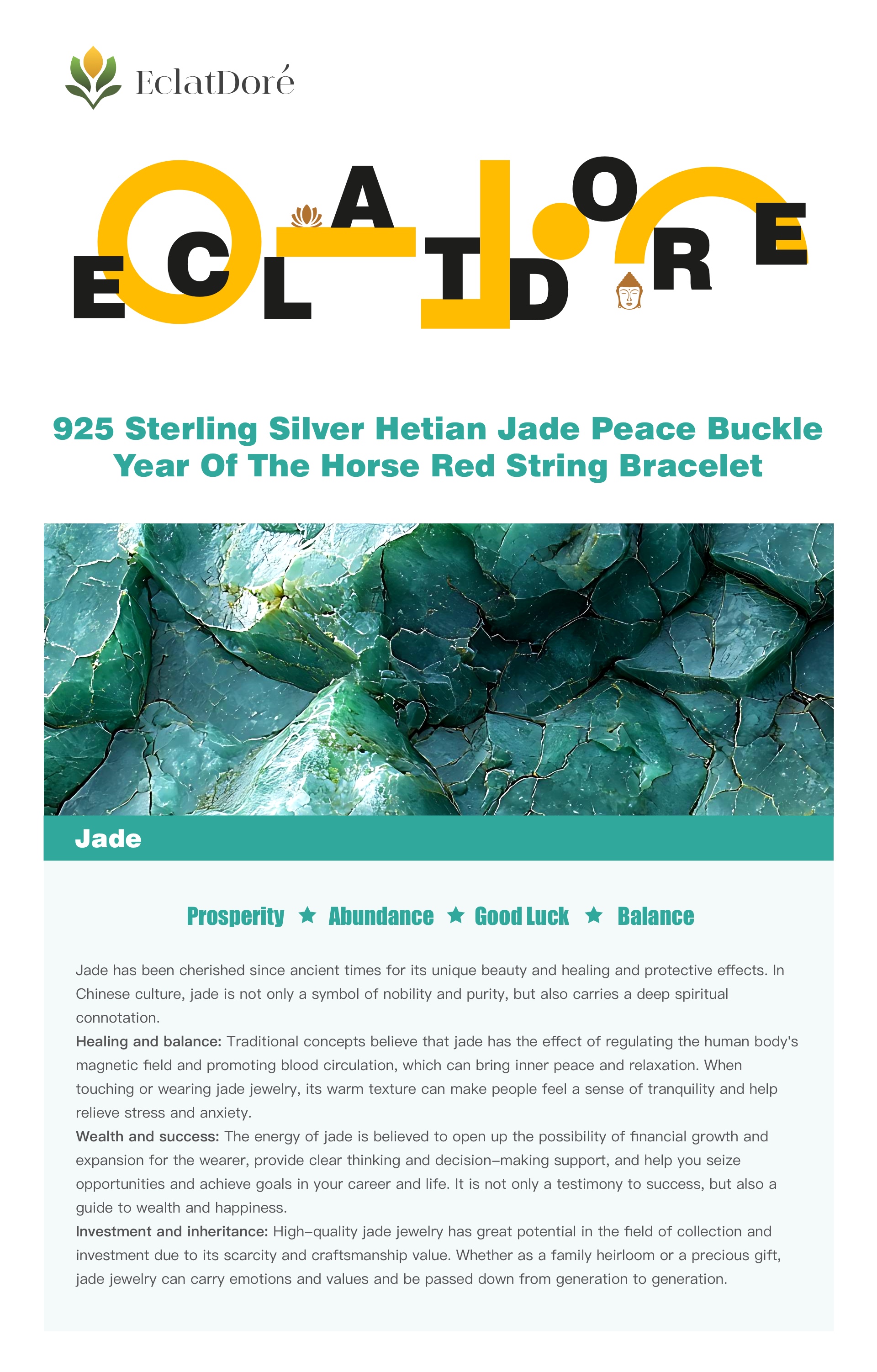 Wealth and success: The energy of jade is believed to open up the possibility of financial growth and expansion for the wearer, provide clear thinking and decision-making support, and help you seize opportunities and achieve goals in your career and life. It is not only a testimony to success, but also a guide to wealth and happiness.