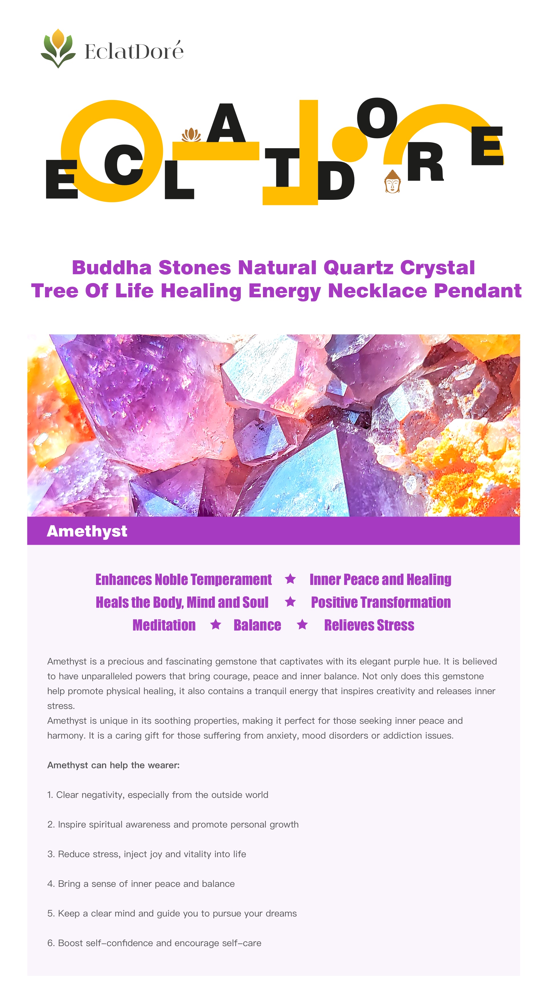 The tree of life in the old Buddhist tradition is the place where Buddha was enlightened. The Amethyst healing stone can increase your courage but keep you at total peace with yourself. You can also enjoy the energies that the stone releases to boost your creativity and reduce your anxiety.