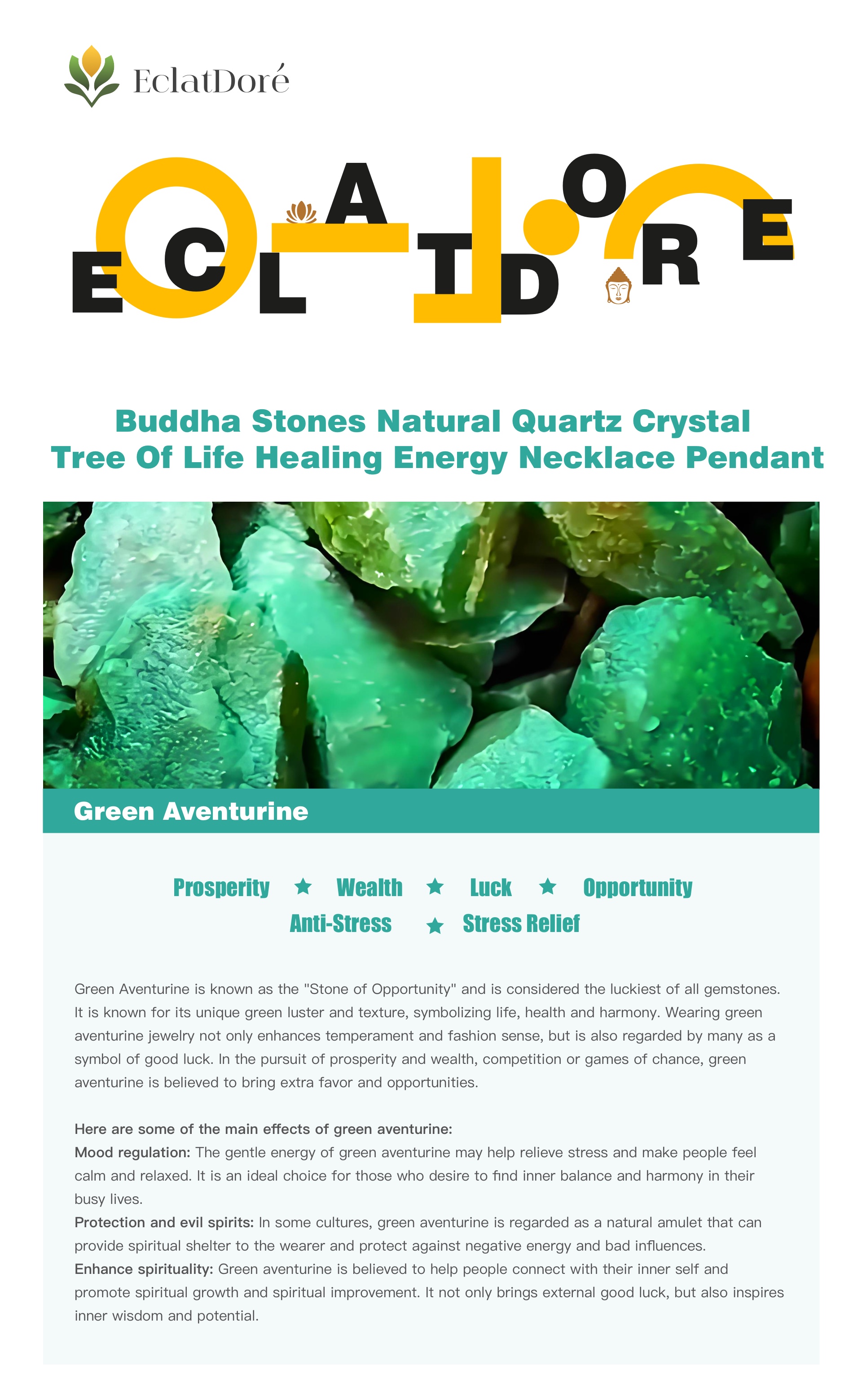 Mood regulation: The gentle energy of green aventurine may help relieve stress and make people feel calm and relaxed. It is an ideal choice for those who desire to find inner balance and harmony in their busy lives.