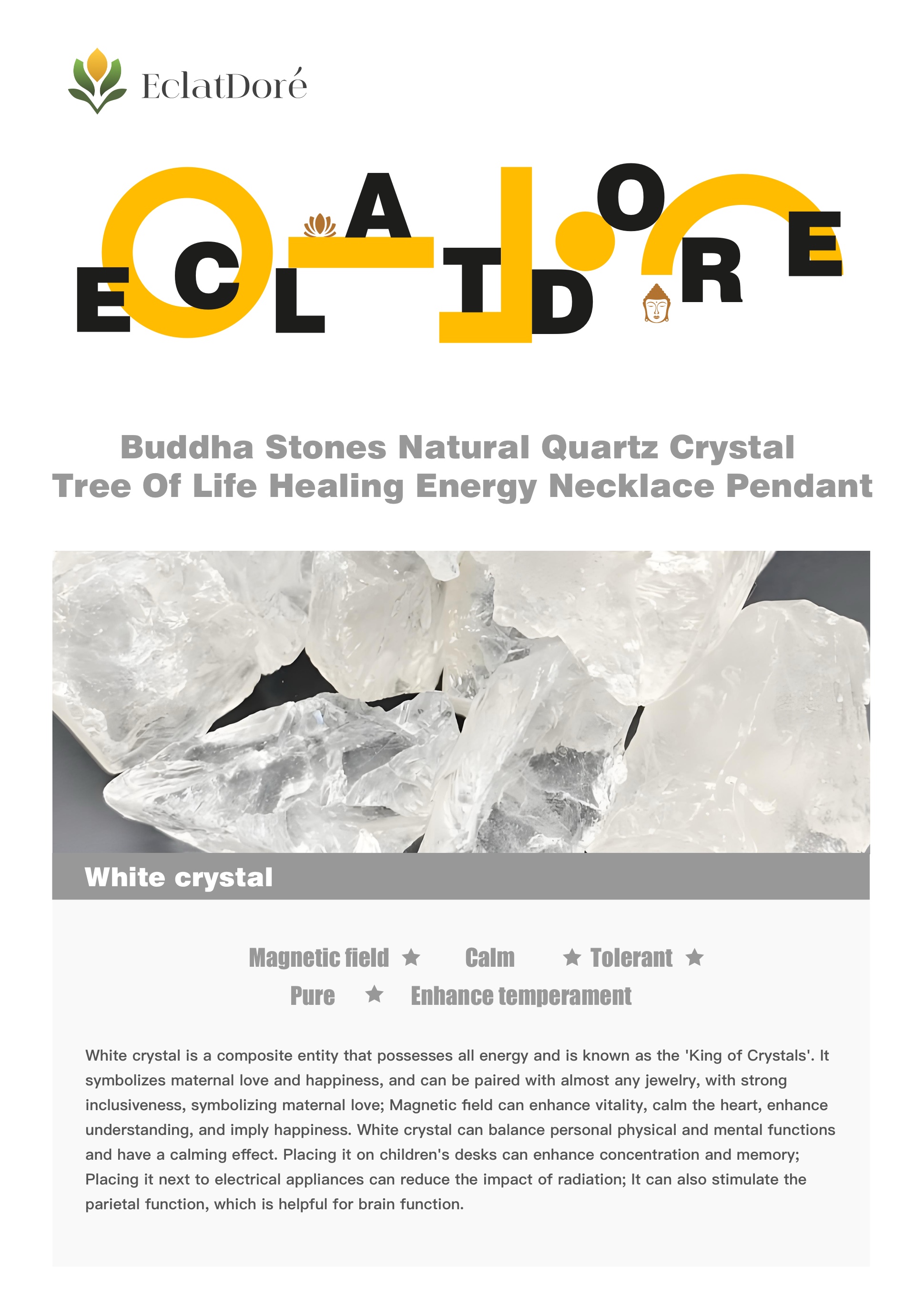 White crystal is a composite entity that possesses all energy and is known as the 'King of Crystals'. It symbolizes maternal love and happiness, and can be paired with almost any jewelry, with strong inclusiveness, symbolizing maternal love; Magnetic field can enhance vitality, calm the heart, enhance understanding, and imply happiness. White crystal can balance personal physical and mental functions and have a calming effect. Placing it on children's desks can enhance concentration and memory; Placing it next to electrical appliances can reduce the impact of radiation; It can also stimulate the parietal function, which is helpful for brain function.