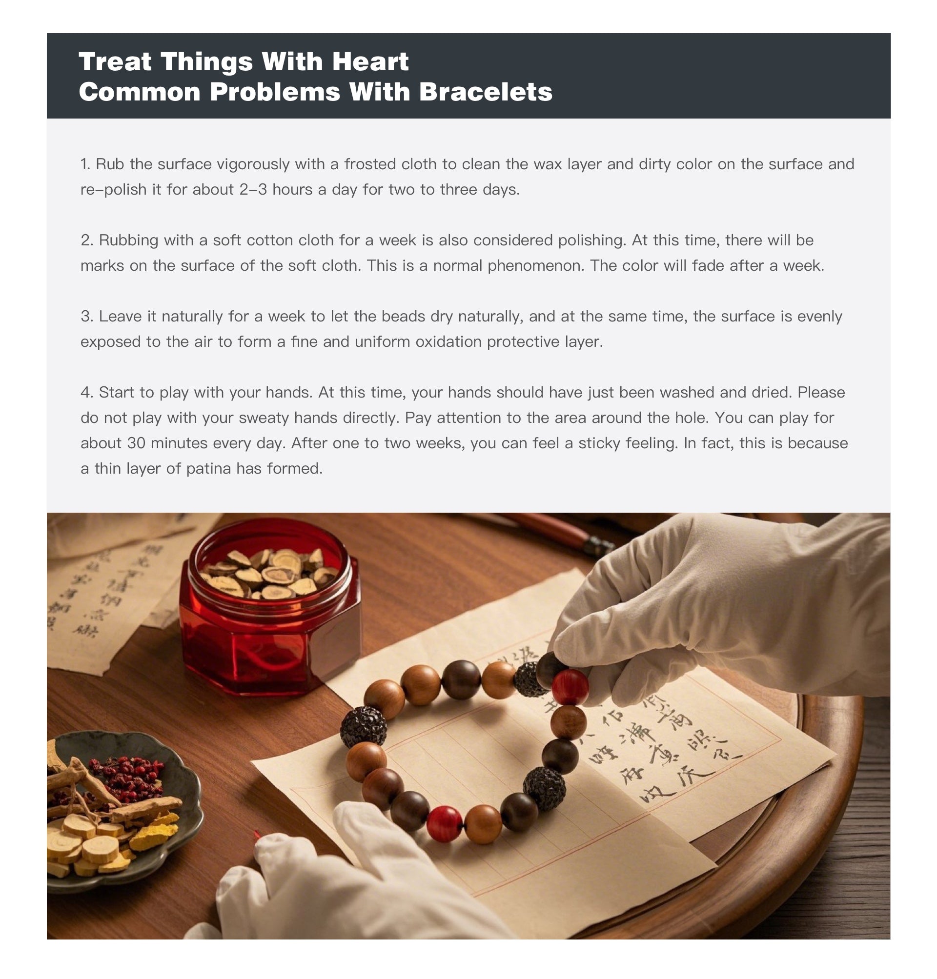 The bracelets are made by a group of devout Buddhists and skilled craftsmen. Each piece is selected from natural raw materials, blended with rare ambergris, and Buddhist cultural elements are incorporated into the design through hand-carving. Our vision is to perfectly combine traditional culture with modern craftsmanship to provide the wearer with a high-end bracelet that not only brings visual enjoyment but also conveys peace of mind.