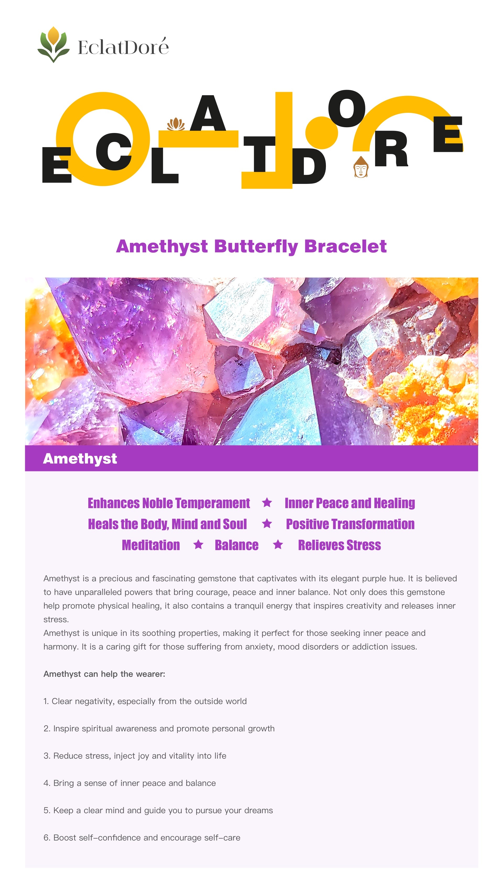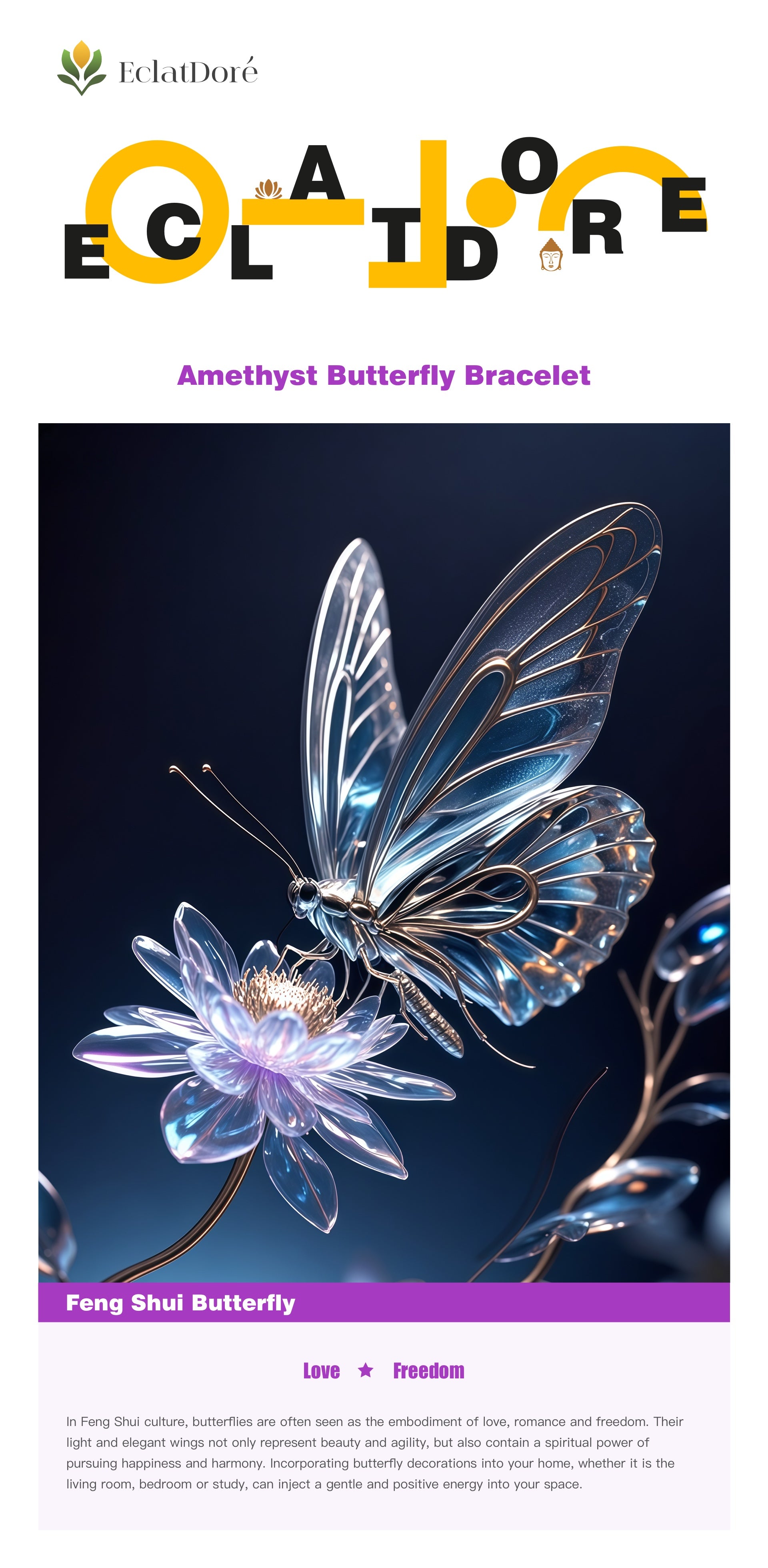 Unique jewelry perfectly combines the beauty of nature with mysterious power. The energy of carefully selected high-quality amethyst can inspire courage, enlighten the mind, promote healing and creativity; the delicate butterfly shape symbolizes the soul's journey of love and freedom. Wearing it, let the inner strength and outer elegance resonate harmoniously, and start the transformation of your life.