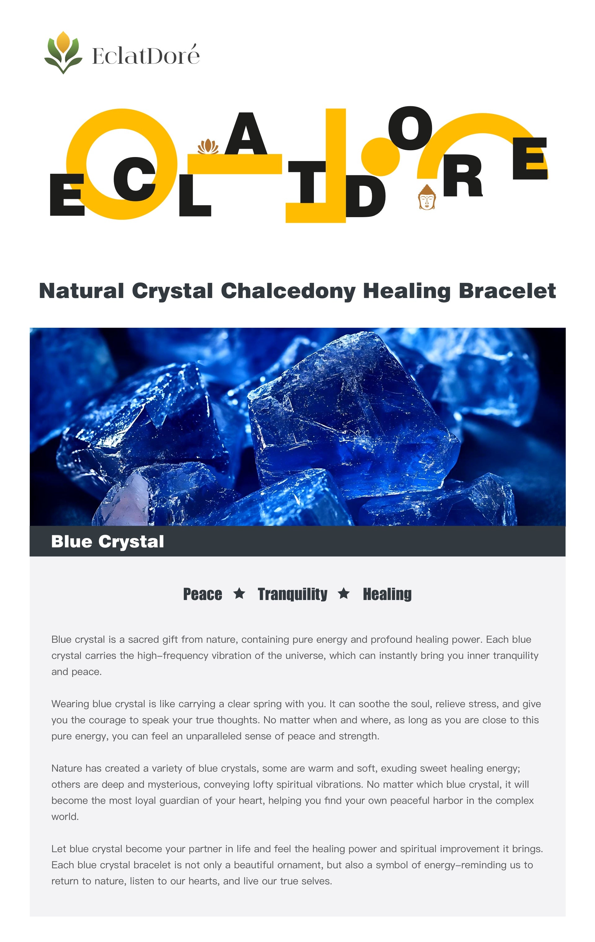 Let blue crystal become your partner in life and feel the healing power and spiritual improvement it brings. Each blue crystal bracelet is not only a beautiful ornament, but also a symbol of energy-reminding us to return to nature, listen to our hearts, and live our true selves.