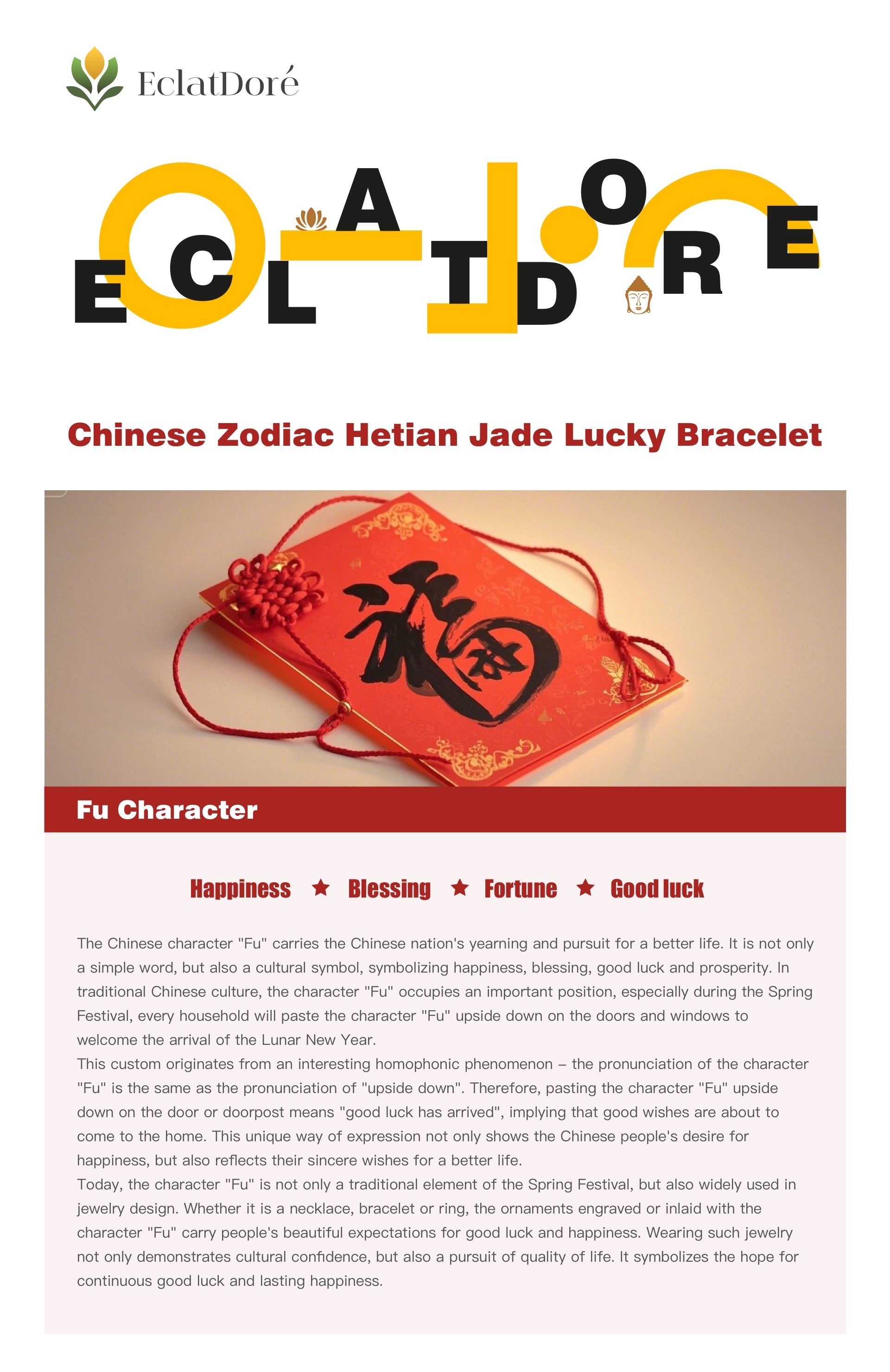 Today, the character "Fu" is not only a traditional element of the Spring Festival, but also widely used in jewelry design. Whether it is a necklace, bracelet or ring, the ornaments engraved or inlaid with the character "Fu" carry people's beautiful expectations for good luck and happiness. Wearing such jewelry not only demonstrates cultural confidence, but also a pursuit of quality of life. It symbolizes the hope for continuous good luck and lasting happiness.