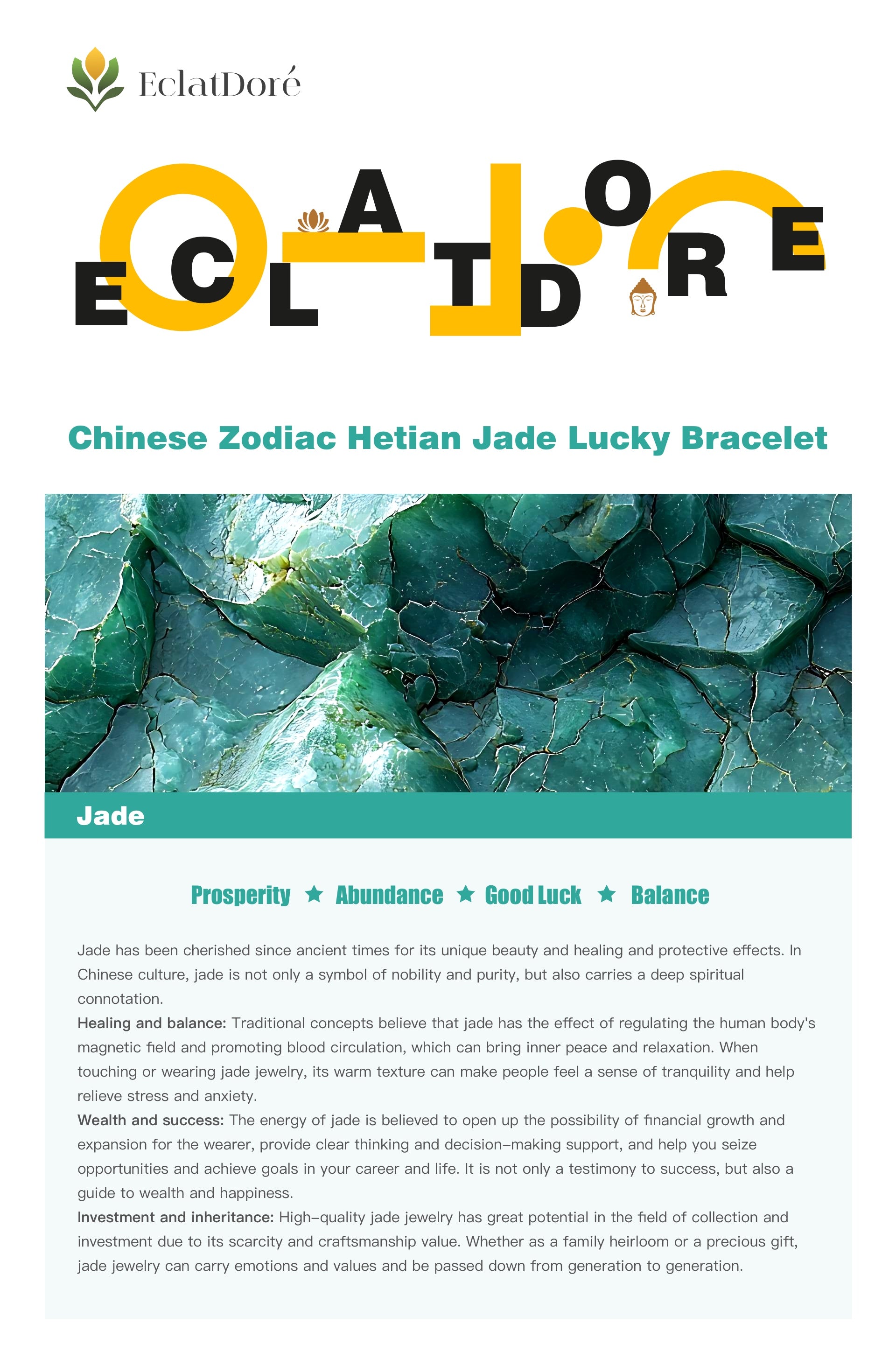 Wealth and success: The energy of jade is believed to open up the possibility of financial growth and expansion for the wearer, provide clear thinking and decision-making support, and help you seize opportunities and achieve goals in your career and life. It is not only a testimony to success, but also a guide to wealth and happiness.