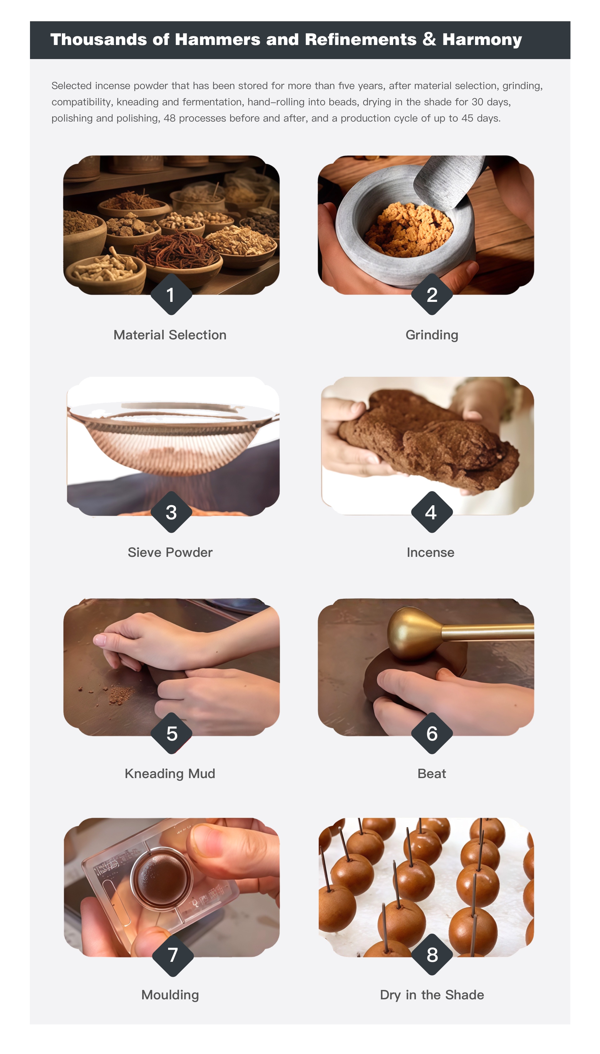 As the name suggests, a bead is made of a variety of spices, which means that the combination of spices makes a fragrance. Multiple beads are strung together for wearing, which is rich in health and nourishment. Five-element combined fragrance beads use different fragrances and are designed based on the traditional culture of the five elements and five virtues. There is poetry in the fragrance, which penetrates time and slowly feels the beauty of life.Among thousands of incense recipes, the traditional craftsmanship of the five-element combined fragrance beads has been determined.            Integrating the wisdom of Chinese medicine's "monarch, minister, assistant and messenger" combination, the incense beads combine sandalwood, agarwood, mugwort and other natural incense medicines in ancient methods, turning them into wearable "breathing healing devices".