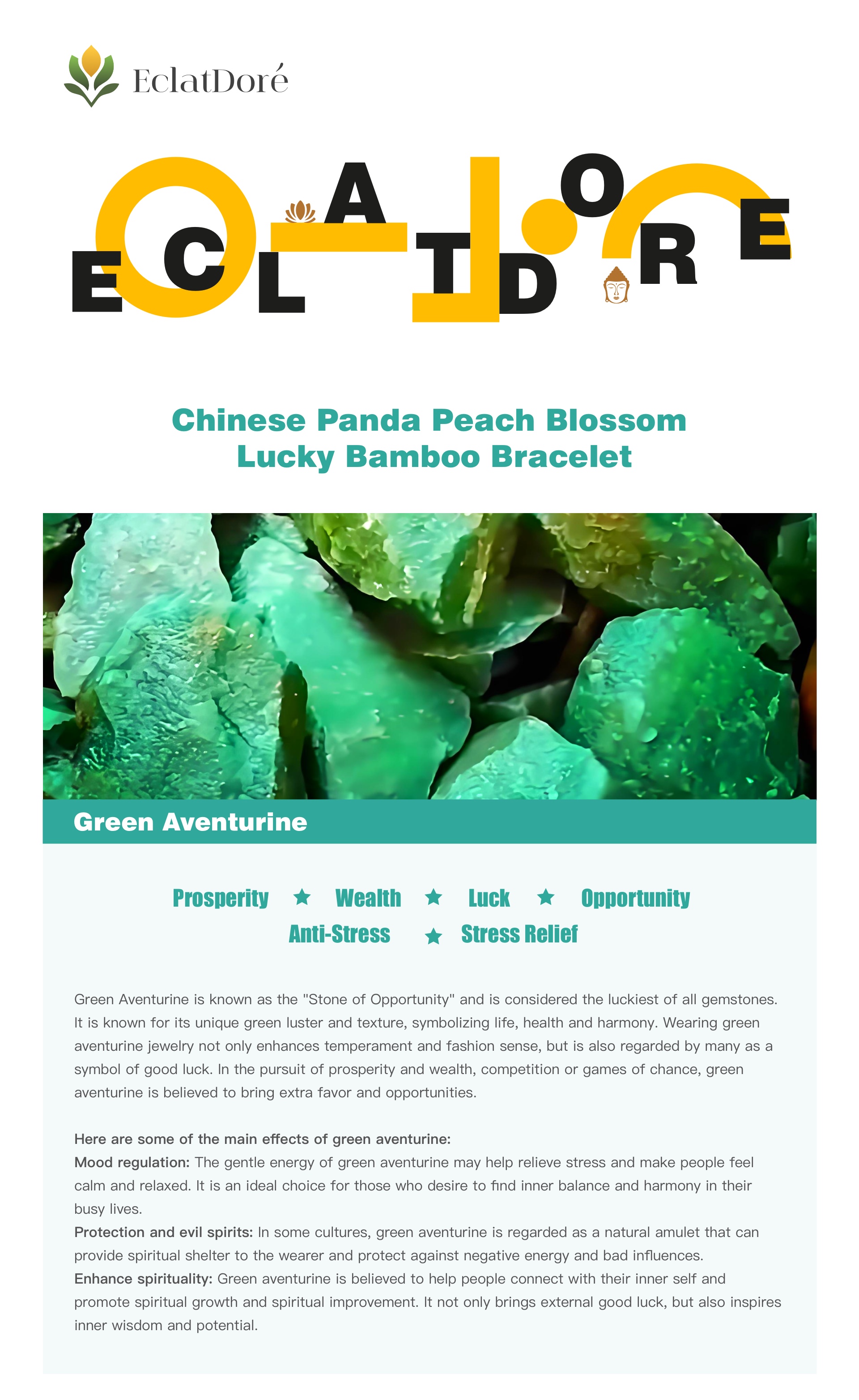 Mood regulation: The gentle energy of green aventurine may help relieve stress and make people feel calm and relaxed. It is an ideal choice for those who desire to find inner balance and harmony in their busy lives.