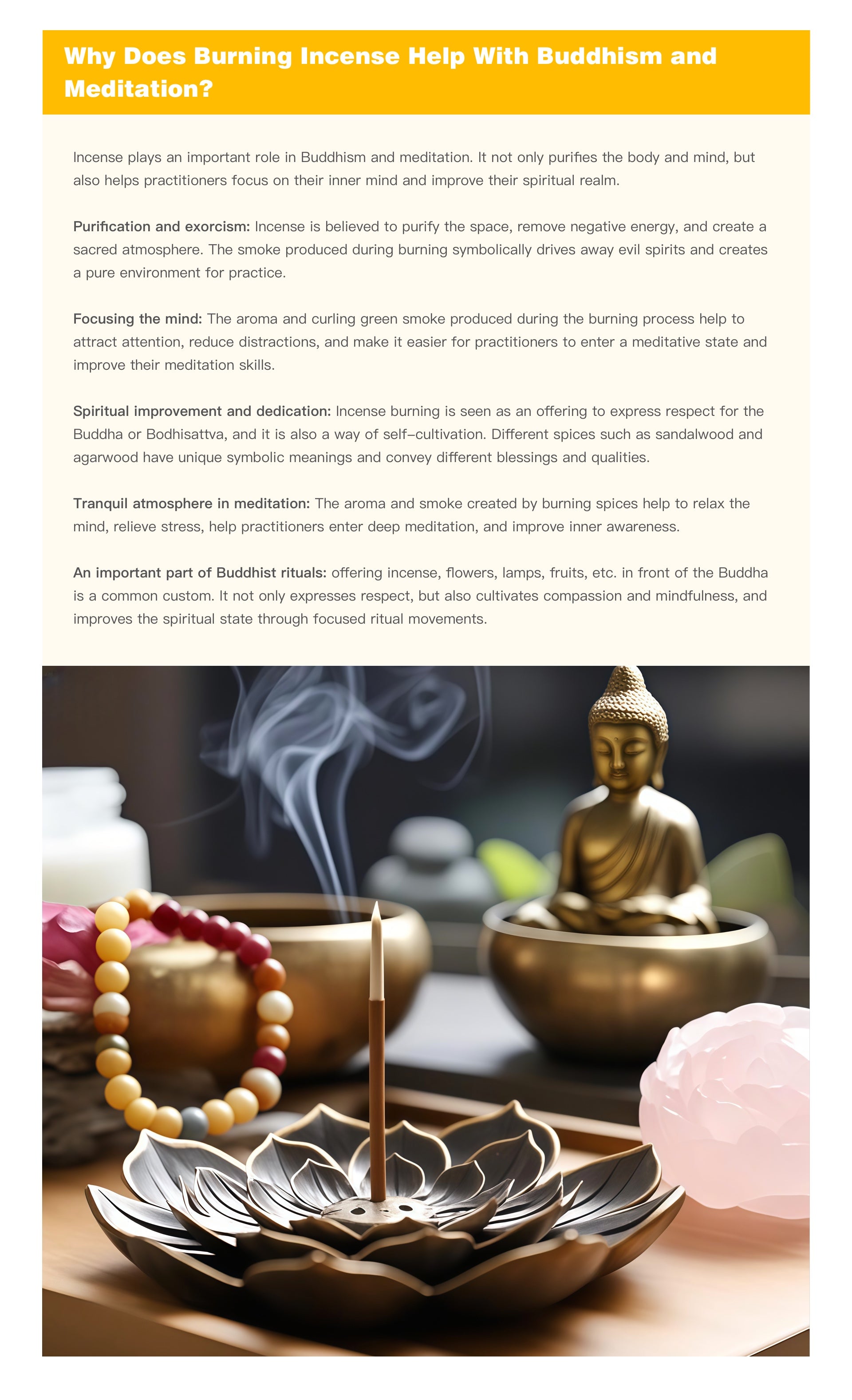 Tranquil atmosphere in meditation: The aroma and smoke created by burning spices help to relax the mind, relieve stress, help practitioners enter deep meditation, and improve inner awareness.