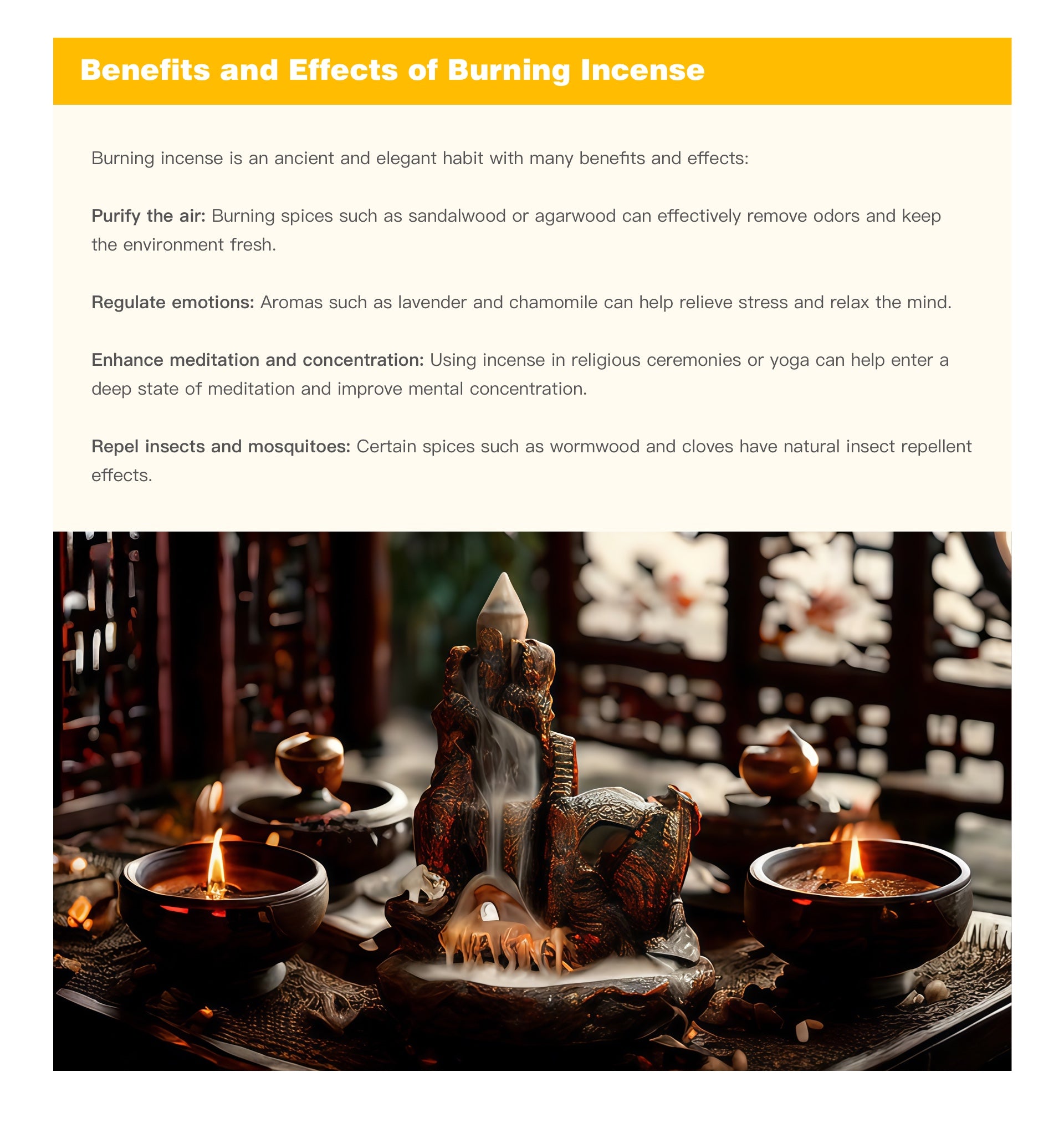 Enhance meditation and concentration: Using incense in religious ceremonies or yoga can help enter a deep state of meditation and improve mental concentration.