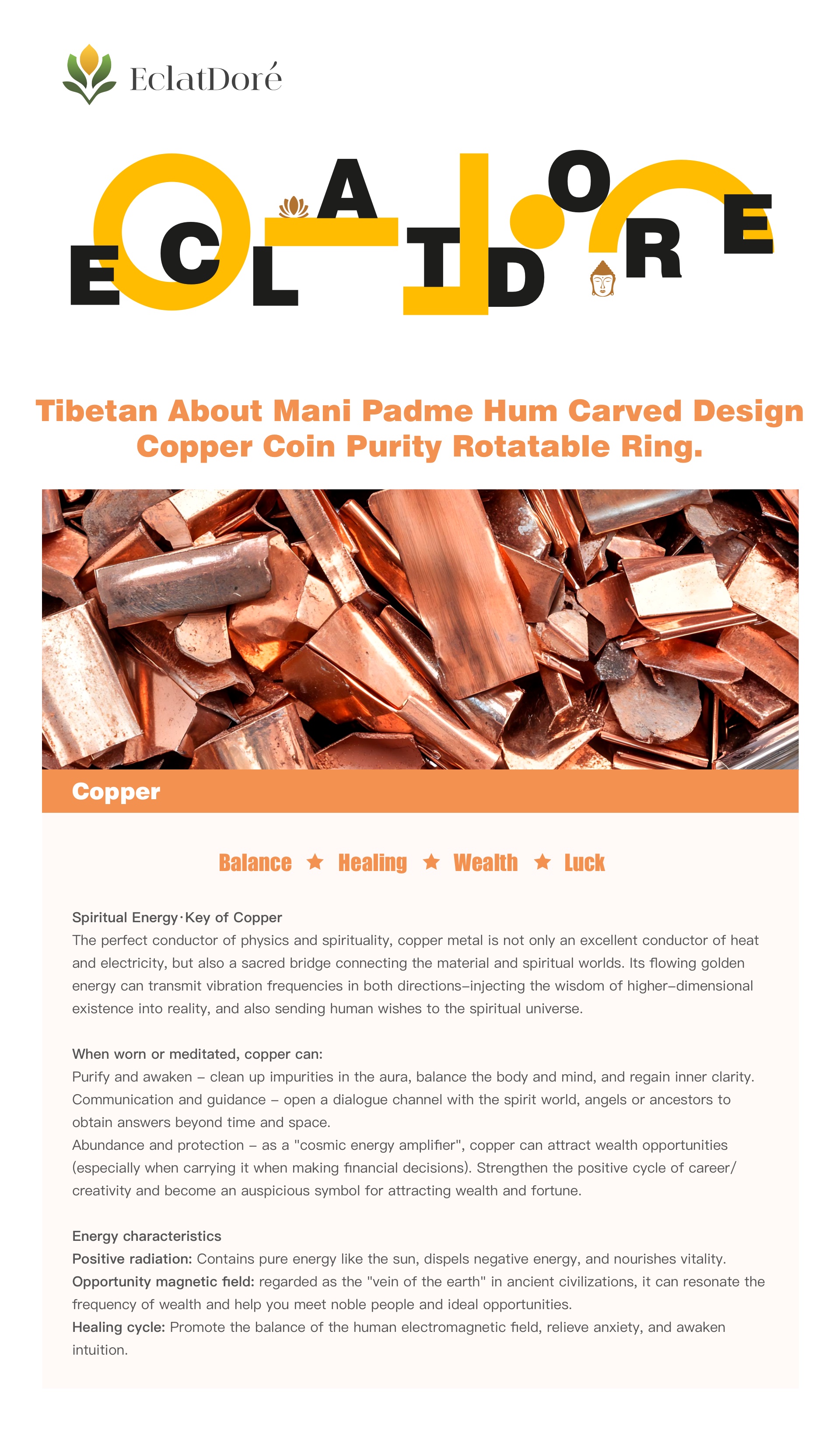 Forged using ancient methods, the copper ring is not only a witness to time but also a powerful energy conductor. The subtle friction between the coin and your fingertip during rotation creates a unique tactile meditation experience, helping your mind quickly return to the present moment. This ring is both a personal amulet and a dynamic tool for spiritual practice, allowing the power of the ancient mantra to permeate your life with each turn, safeguarding inner clarity and peace amidst the hustle and bustle of the world. With each turn, there is purification and awakening.